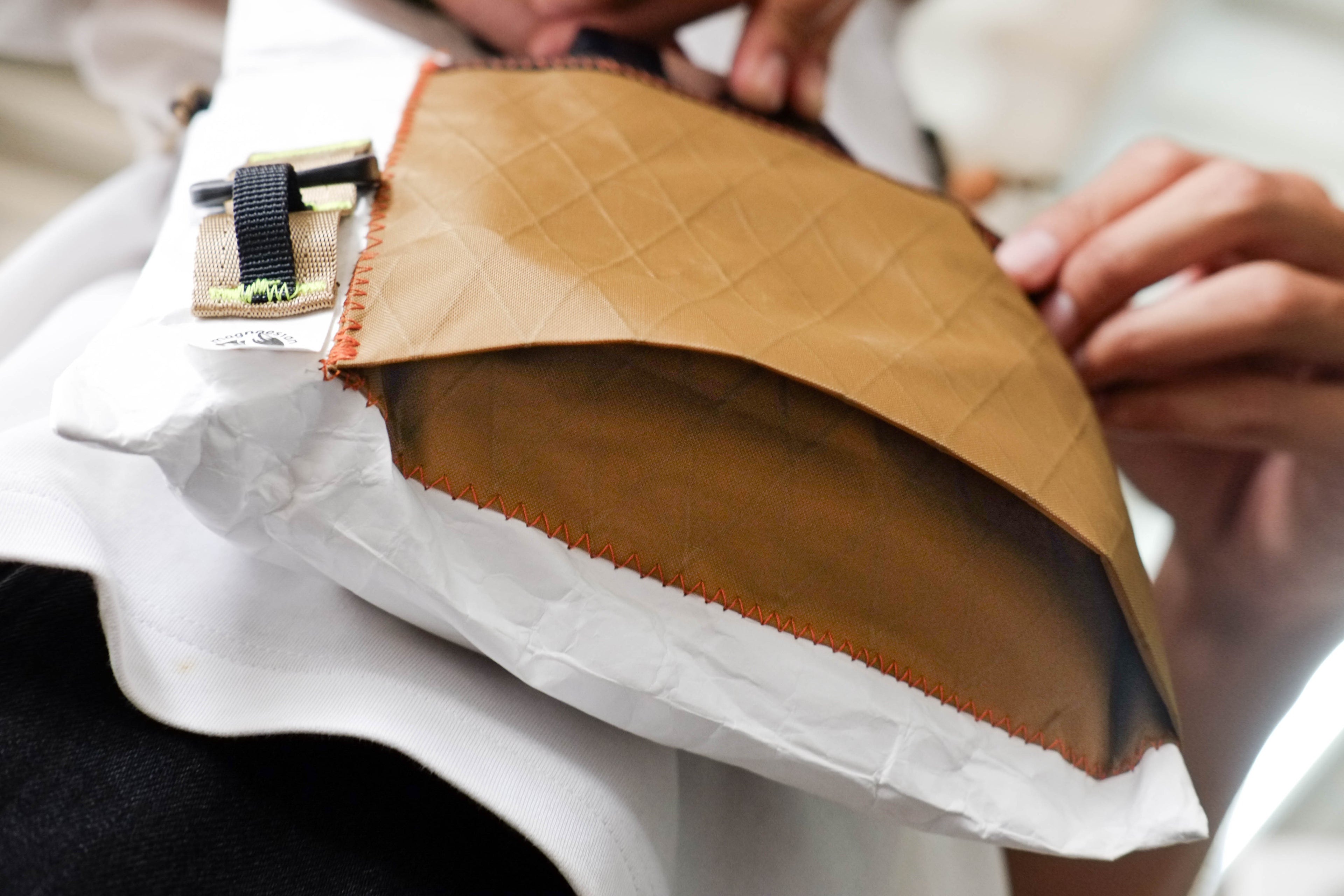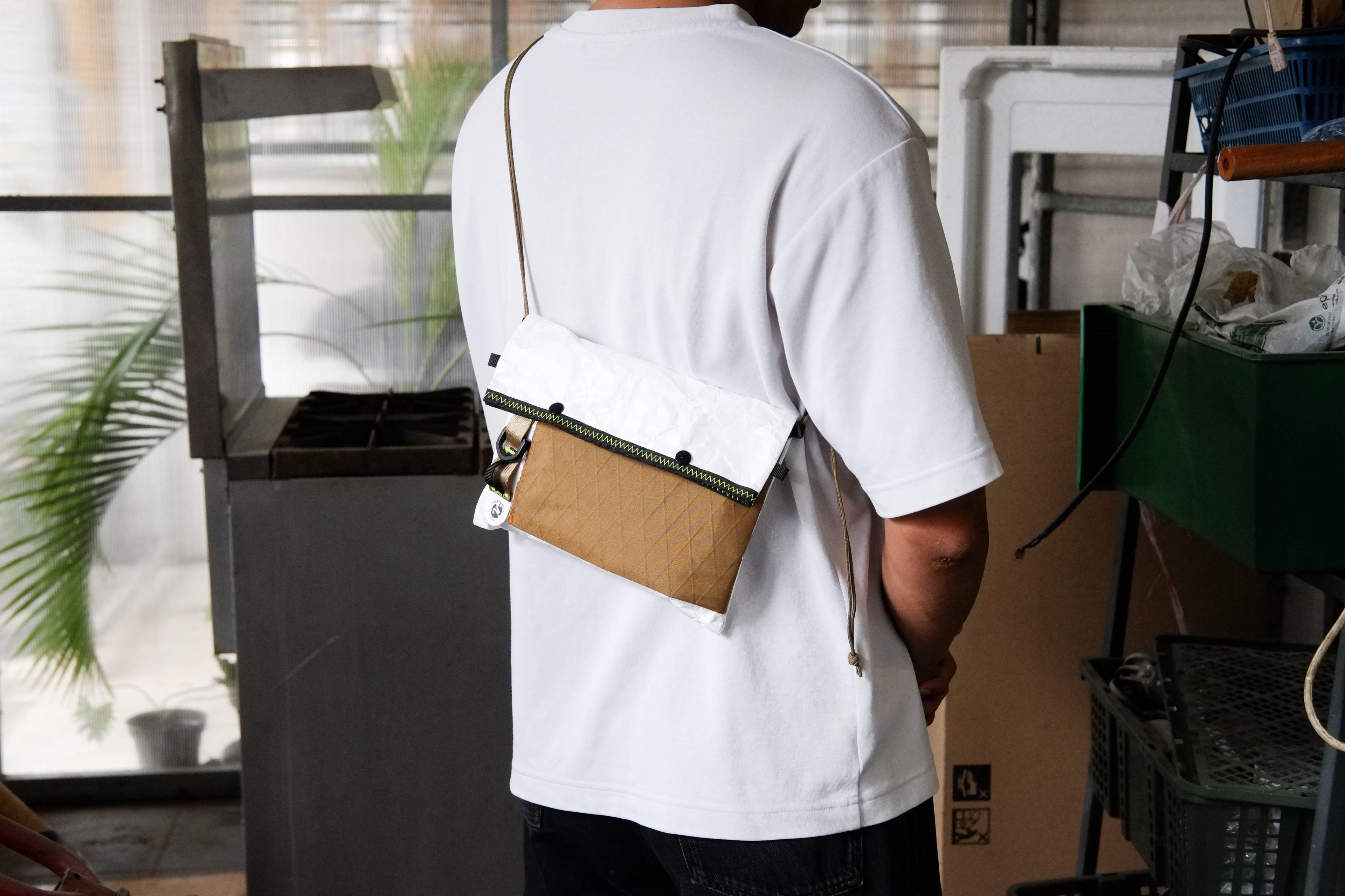 Sacoche bag with one main compartment and one expandable front pocket, made from Tyvek® 1082D (105 gsm) combined with VX21 X-Pac™ repurposed from studio waste.
