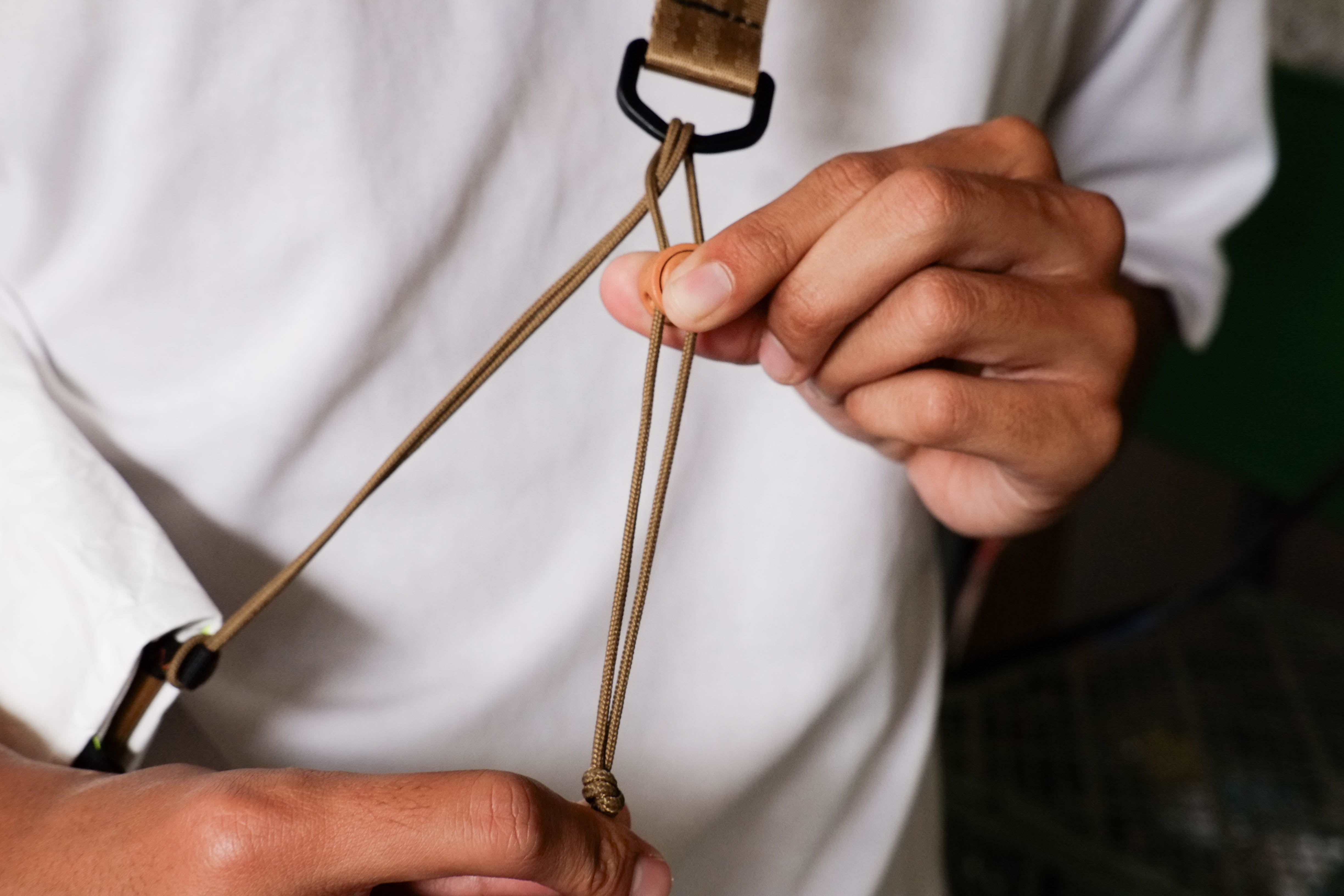 A mixed system of mil-spec nylon webbing and tactical paracord, combined with a cord adjuster for fast adjustment.